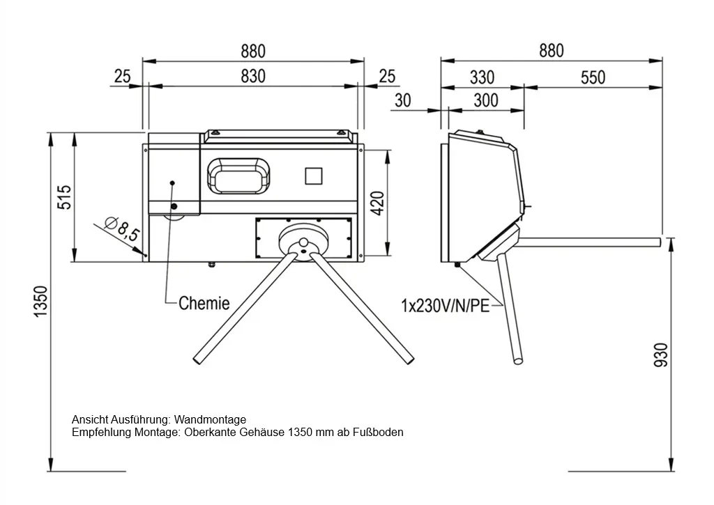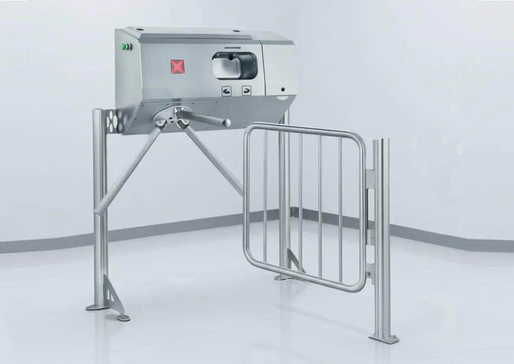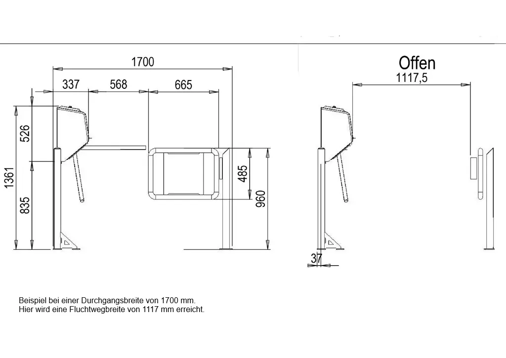 Unser Drehkreuz mit abklappbarem oberem Sperrarm vereint zuverlässige Zutrittskontrolle im Normalbetrieb mit sicherer Freigabe im Notfall. Um den Richtlinien der ASR A2.3 im Hinblick auf lichte Flucht- und Rettungswegbreiten gerecht zu werden, gehört zum Lieferumfang zwingend ein Fluchttor mit Flächenhaftmagnet, welches an der gegenüberliegenden Seite als Gegenstück montiert werden muss. Wird der Not-Aus betätigt, entriegelt der oberer Sperrarm automatisch und klappt kontrolliert nach unten — so entsteht sofort ein barrierefreier Fluchtweg.