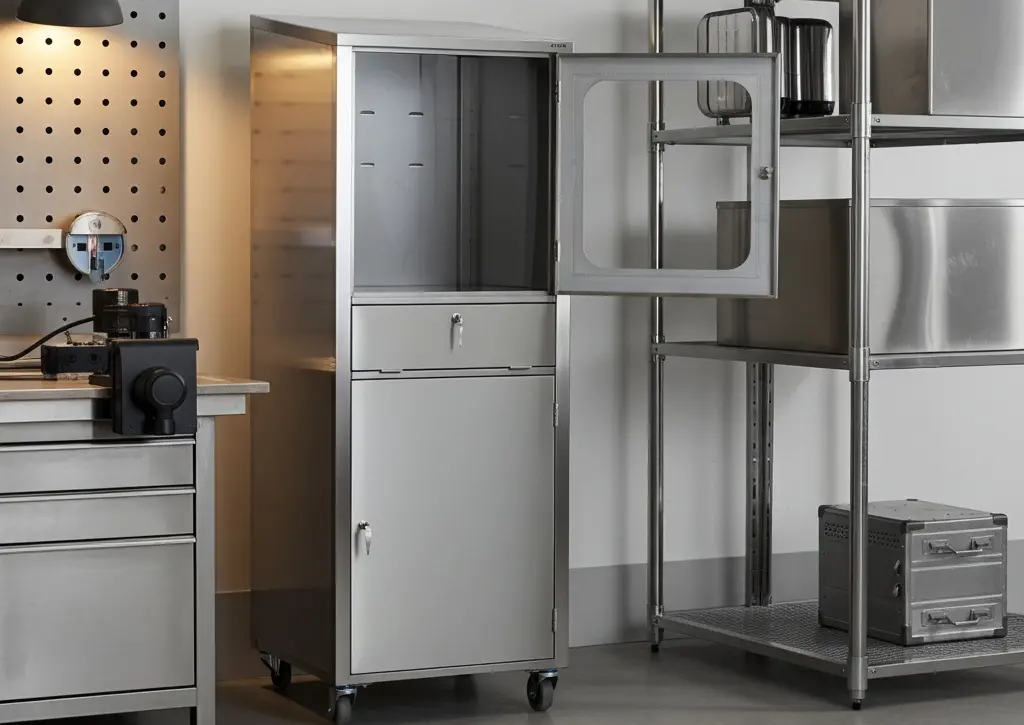 Unsere Computerschränke/ PC-Schränke bieten eine optimale Unterbringung von Computern in sensiblen Bereichen. Durch das Schrägdach, wird das Ablegen von Gegenständen verhindert. Somit bleibt das Schrankdach sauber und einsehbar. Diese fahrbare Ausführung ermöglicht das flexible Arbeiten. Durch die hochwertige und aufwendige Fertigung ist der Schrank im Frontbereich spritzwassergeschützt.